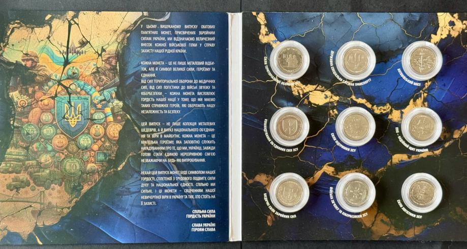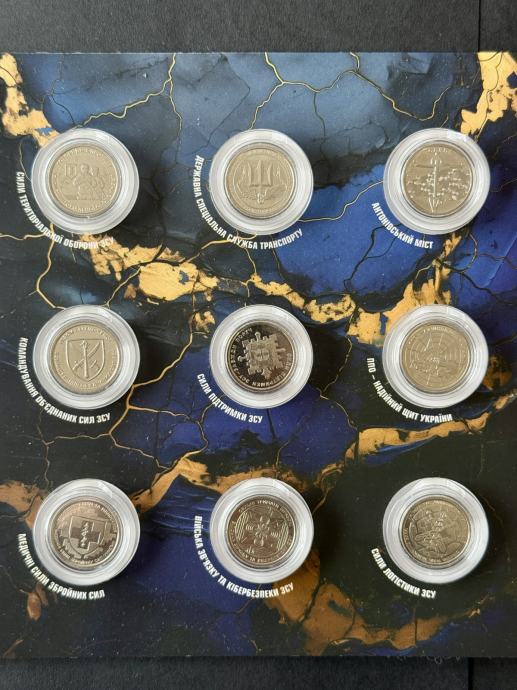 Posebno izdanje prigodnih kovanica Ukrajine za 2022.-2024., UNC, 9 kovanica u setu. Teritorijalne obrambene snage Oružanih snaga Ukrajine, Državna specijalna transportna služba, Antonovski most, Zapovjedništvo združenih snaga, Snage potpore Oružanih snaga Ukrajine, Protuzračna obrana, Medicinska služba, Postrojenja za komunikaciju i kibernetičku sigurnost, Logističke snage