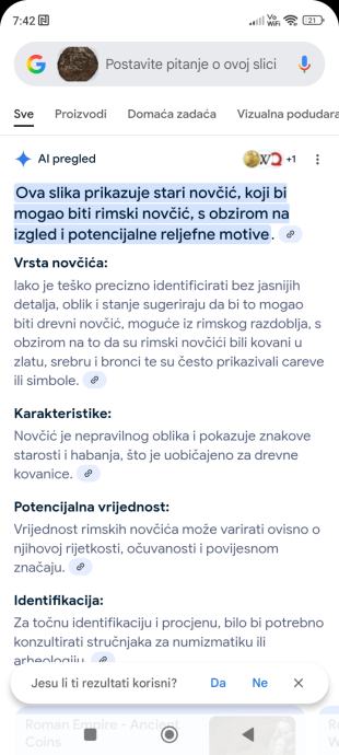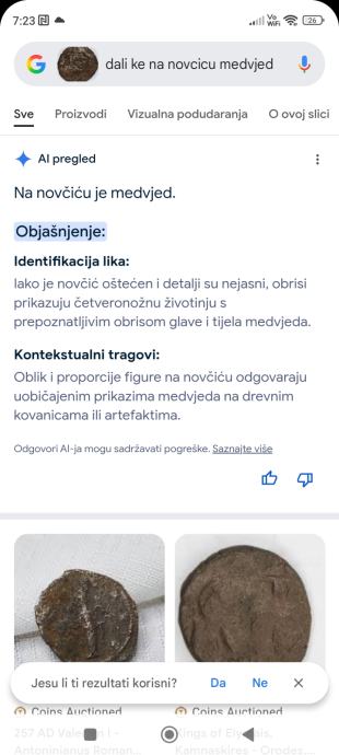 Kovanica ili zeton o kojem neznam ali bas nista,osim sto mi je AI ( umjetna inteligencija) na osnovu slike rekla da se radi o Rimskom novcicu sa medvjedom otisnutim na prednjoj strani.Ovu kovanicu je pronašao moj brat prije 20- tak godina i tek sam sada skuzio da bi to mogao biti novcic.Pronadena je u duplji drveta koji je bio potporni stup na jednoj šupi.Evo ako netko zna nešto o ovom predmetu neka se javi na broj 097-660-1365 ili upit na Viber ili Njuskalo, a Šaljem Poštom ili Tiskom ili u dogovoru sa kupcem,. NAPOMENA - MOŽE SE raditi o nekoj bez znacajnoj stvari ,poput žetona, dijela neke igracke ,mozda novcic novije izrade (5 kuna , Dinara ili slično),a moze biti i artefakt ili Rimski novcic,spreman sam riskirati i prodati ga ali neznam za koju vrijednost,on ili ne vrijedi ništa ili vrijedi malo bogatstvo,tako da cu staviti simbolično,a dogovor sa kupcem.Takoder sam poslao sliku na procjenu,ali to moze potrajati.VIDI SLIKE!!