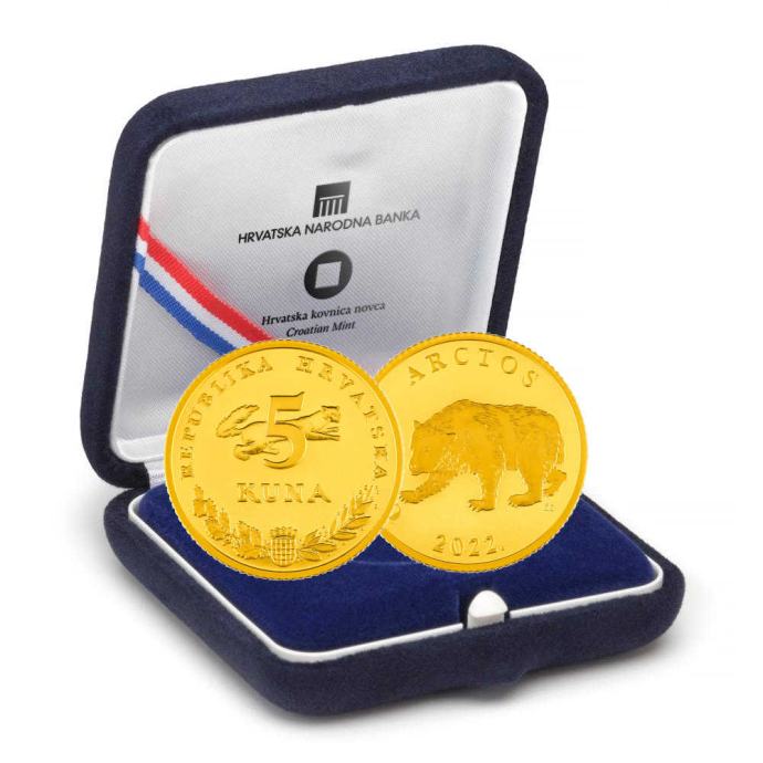 Zlatna kovanica 5 kuna s motivom mrkog medvjeda u izdanju Hrvatske narodne banke i Hrvatske kovnice novca. Ovaj zlatnik podsjeća nas na najveću kunsku kovanicu. Naklada zlatnika 5 kuna Mrki medvjed ograničena je na dvije tisuće i dvadeset dva primjerka