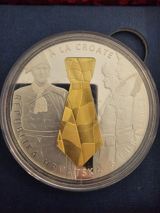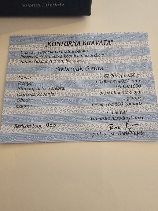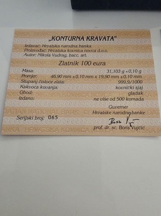 Izdanje „Konturna kravata“ sastoji se od dvije kovanice različitih oblika, izrađenih od različitih plemenitih metala, zlata i srebra. Zlatna numizmatička kovanica prati konture kravate i umetnuta je u srebrnu numizmatičku kovanicu čiji otvor skladno prati zadani oblik, kako bi u kombinaciji činile cjelovit otkov. Zlatnik je nominalne vrijednosti 100 eura i mase jedne unce zlata (31,103 grama), dok je srebrnjak nominalne vrijednosti 6 eura i mase dvije unce srebra (62,207 grama).