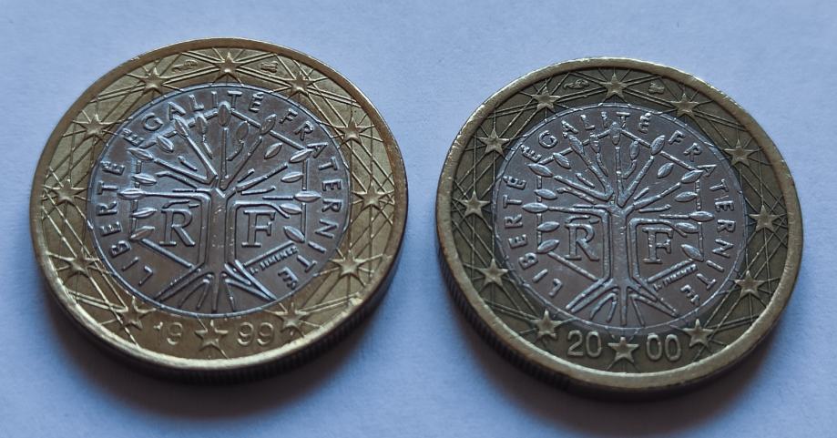 2. Dvije kovanice od 1 eura (France – Tree of life) iz 1999. i 2000. godine, obje kovanice imaju određene pogreške, vidljivo na slikama kao i drugi detalji,