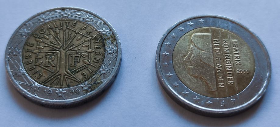 5. Dvije kovanice od 2 eura (France & Netherland) iz 1999. i 2000. godine, obje kovanice imaju određene pogreške, vidljivo na slikama kao i drugi detalji,