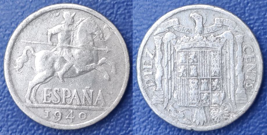 Spain 10 céntimos, 1940 Lettering: "PLVS" jako rijetko ***/#