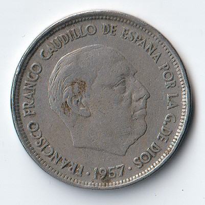 Španjolska 50 Pesetas 1957 – Franco – srebro 800