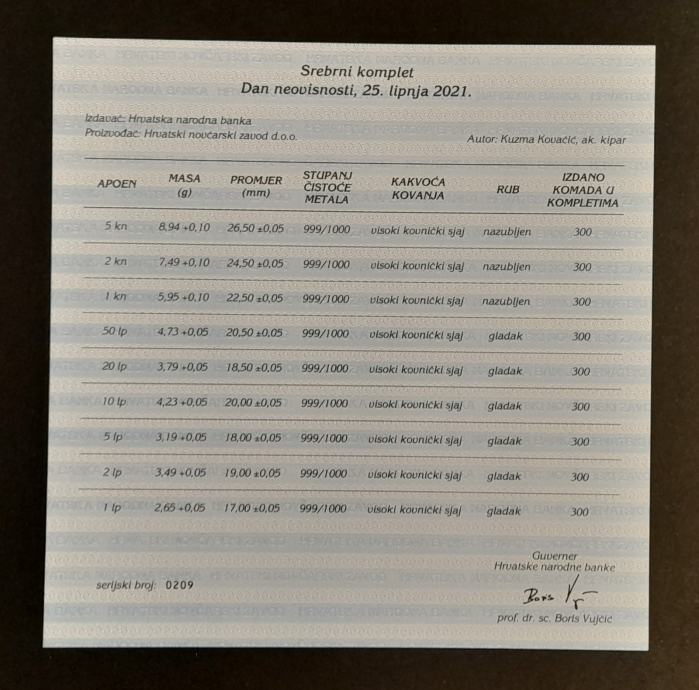 Hrvatska narodna banka u suradnji s državnom kovnicom novca, Hrvatskom kovnicom novca, izdala je numizmatički komplet prigodnoga srebrnog kovanog novca s motivima i nominalnim vrijednostima devet apoena optjecajnoga kovanog novca Republike Hrvatske od 5, 2 i 1 kune te 50, 20, 10, 5, 2 i 1 lipe, s godinom kovanja “2021.” u povodu Dana neovisnosti Republike Hrvatske, 25. lipnja 2021., povijesnoga i političkog događaja važnog za Republiku Hrvatsku.