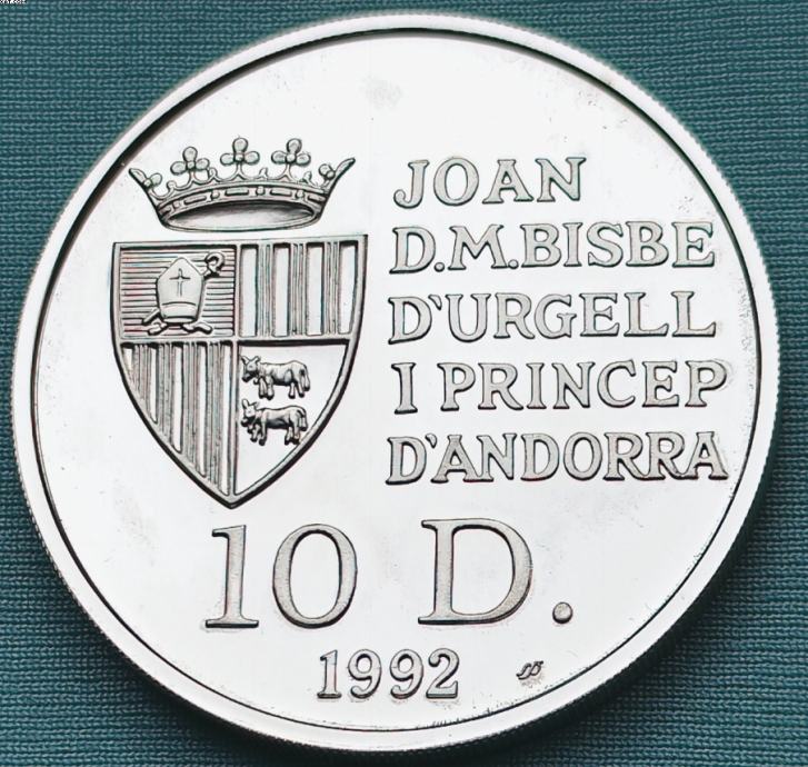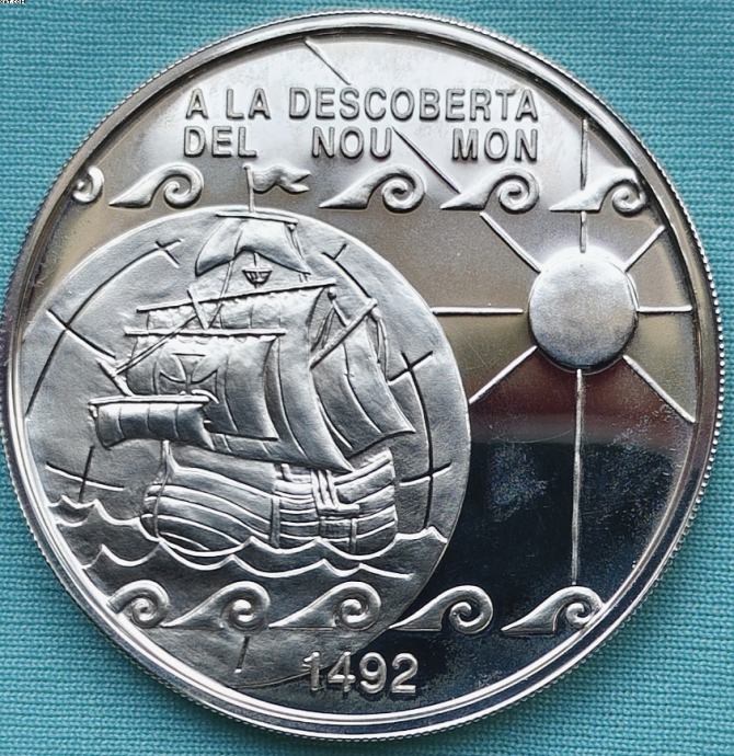 Prodajem iz moje kolekcije srebrnjak Andora 10 Diners iz 1992 komemoracija prilikom otkrivanja Amerike prije 500 godina. Visokopolirana proof kvaliteta limitiran na samo 15000 komada.
