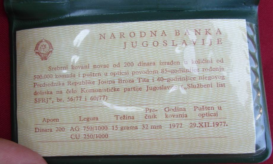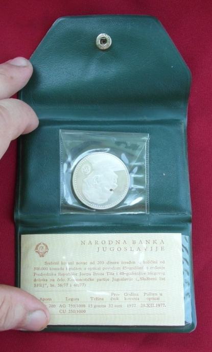 Srebrnjak 200 dinara iz 1977 godine UNC sa cetrifikatom u originalnom etuiu.
