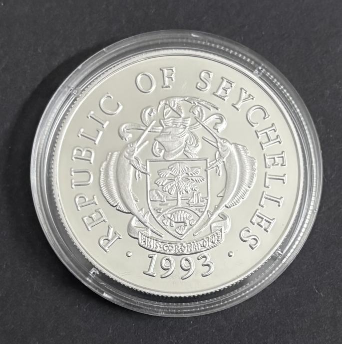 Na aversu se nalazi grb Republike Sejšeli, dok je na reversu dinamičan motiv nogometaša u akciji s natpisom World Cup 1994. Atraktivno prigodno izdanje zanimljivo kolekcionarima sportskih i tematskih srebrnjaka.