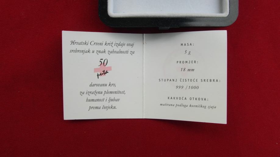 Srebrnjak za 50 darivanja krvi sa certifikatom