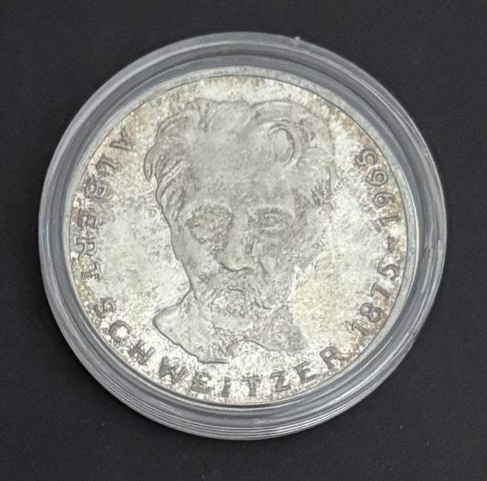 Prodajem srebrnu kovanicu 5 Deutsche Mark, izdanje Savezne Republike Njemačke iz 1975. godine, posvećenu humanistu, liječniku i nobelovcu Albertu Schweitzeru (1875–1965).