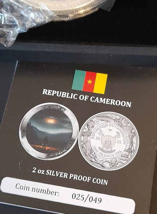 Naličje srebrnjaka prikazuje likove izvanzemaljaca, osvijetljene svojim svemirskim brodom. Žive, ali tamne boje prenose ideju misterije i nerazumljivosti. Na vrhu naličja nalazi se natpis: "WE ARE NOT ALONE" - naziv serije. Na dnu naličja nalazi se natpis: "THEY ARE OUT THERE". Lice kovanice prikazuje grb Kameruna i sve oko njega, razne slike izvanzemaljaca i NLO-a te natpise: "REPUBLIQUE DU CAMEROUN" - zemlja izdavanja, "2025" - godina izdavanja i "2000 FRANCS CFA" - nominalna vrijednost.