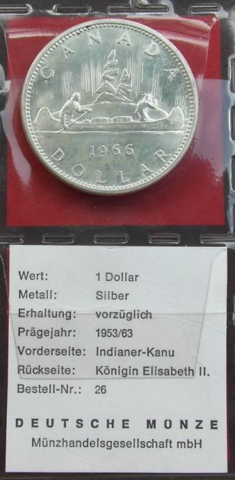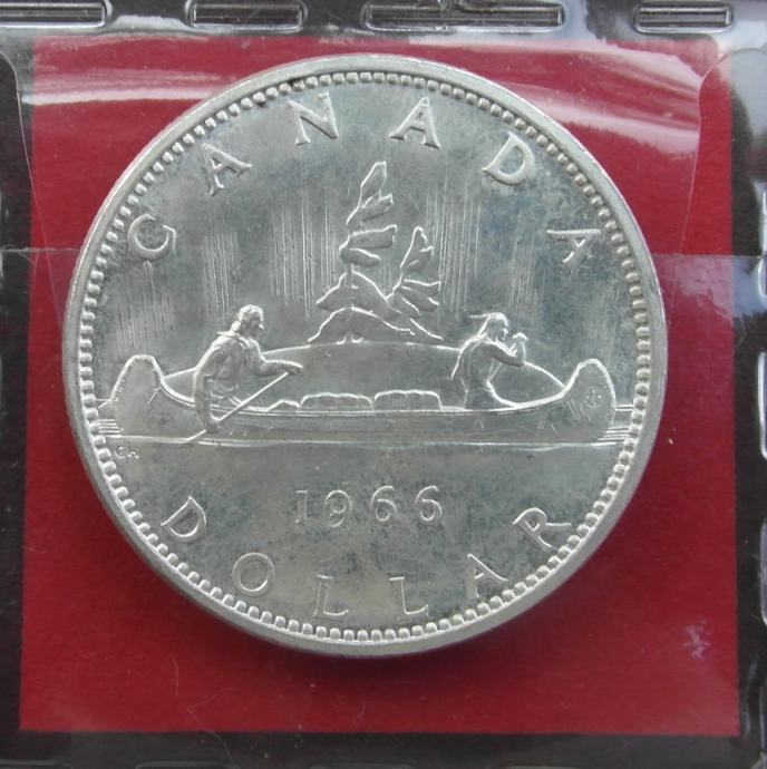 Kanadski srebrni novčić od 1 dolara iz 1966. godine izrađen je od 80% srebra s prikazom kraljice Elizabete II. na licu i traperima u kanuu na naličju, težine 23,33 g i promjera 36 mm. Ovi novčići dio su serije kovane od 1935. do 1967. godine i popularni su među kolekcionarima, cijenjeni zbog sadržaja srebra i povijesnog dizajna.