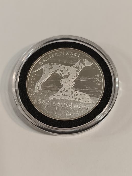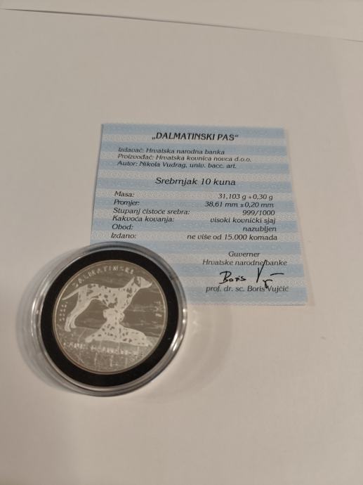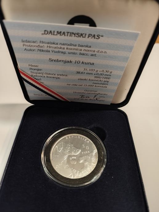 Srebrnjak dalmatinski pas od 1 unce izdan 2021. godine koji dolazi u ukrasnoj kutiji sa certifikatom koji potpisuje guverner Hrvatske narodne banke. Poštarinu plaća kupac. Mob. 099 267 4205.
