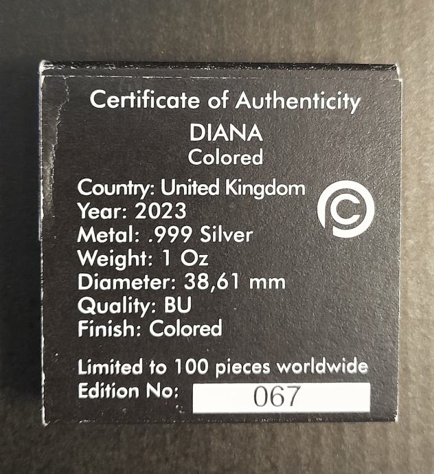 Srebrnjak DIANA 1 unca obojani (067/100) - EKSTREMNO RIJETKO