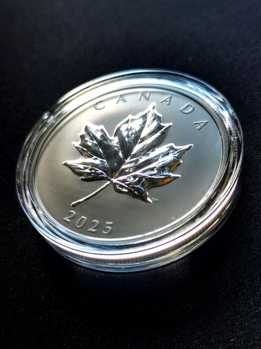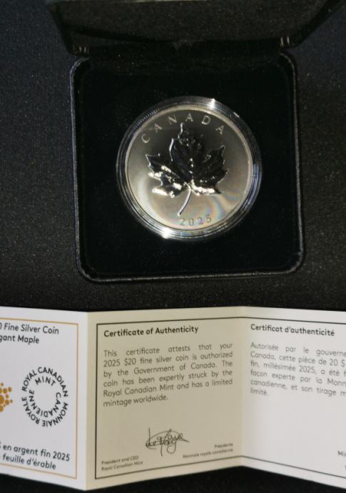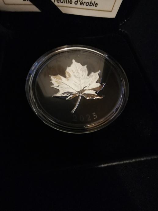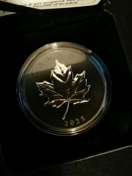 Javorov list 1 unce čistog srebra 99,99% u mat proof kvaliteti selektivno presvučeno crnim rodijem, ograničen na 7000 komada.