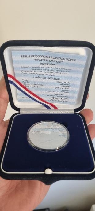 Prodajem 50x prigodnih srebrnjaka "Hrvatski gradovi" Dubrovnik. Nalaze se u blisteru (nikad vađeni) i ukrasnoj kutiji sa certifikatom. Apoen 200 kuna. Promjer 40 mm. Osobna primopredaja ili poštarina nakon vidljive uplate.