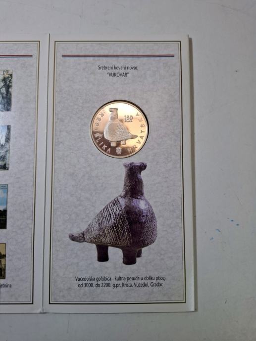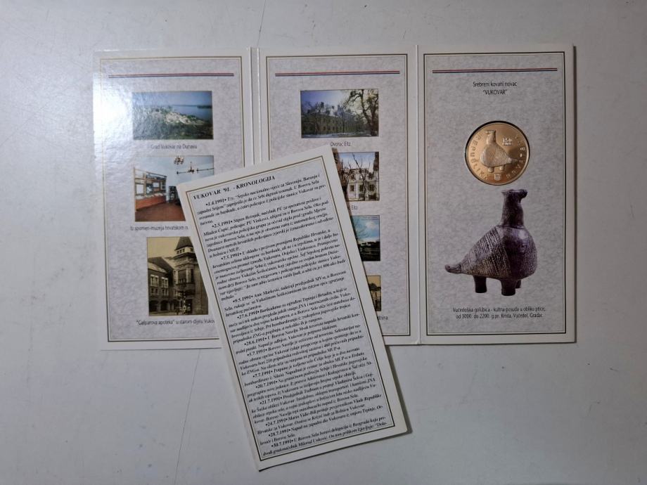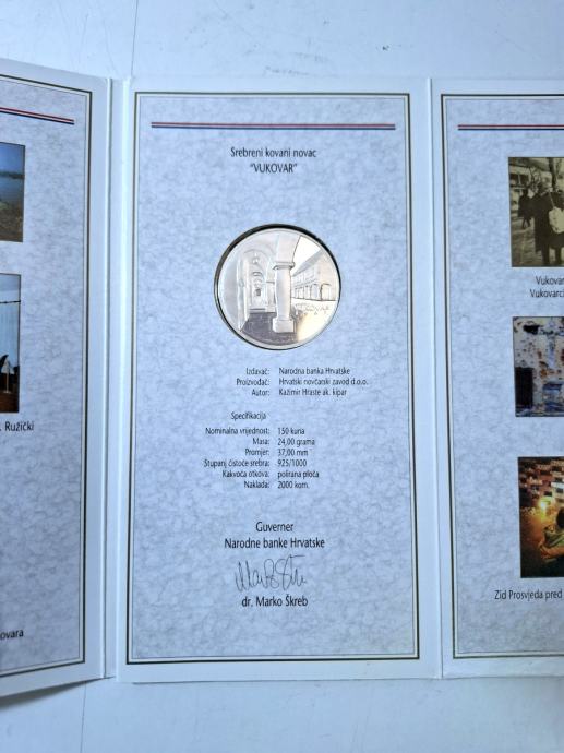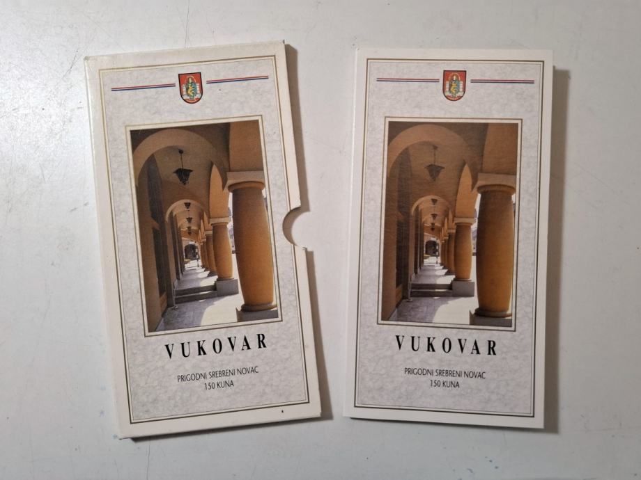 "Narodna banka Hrvatske izdala je prigodni zlatni kovani novac od 500 kuna i prigodni srebreni kovani novac od 150 kuna u trajni spomen gradu Vukovaru i njegovim braniteljima, simbolu hrvatske borbe za obranu slobode u Domovinskom ratu. Vukovar je grad i najveća hrvatska riječna luka na Dunavu, u hrvatskom dijelu Srijema, administrativno središte Vukovarsko-srijemske županije. Godine 1991. hrvatski grad Vukovar bio je pod dugotrajnom potpunom opsadom i svakodnevno granatiran. Dana 19. studenog 1991. jugoslavenska armija, lokalni pobunjeni Srbi i paravojne bande iz Srbije, uspjeli su zauzeti Vukovar, nakon čega je uslijedilo ubijanje i protjerivanje svog nesrpskog stanovništva. Do pada Vukovara, vukovarski branitelji nanijeli su teške gubitke jugoslavenskoj vojsci tako da više nije bila sposobna poduzimati veće vojne akcije osvajanja hrvatskog teritorija." (opis i podaci preuzeti sa stranice kunalipa.com)
