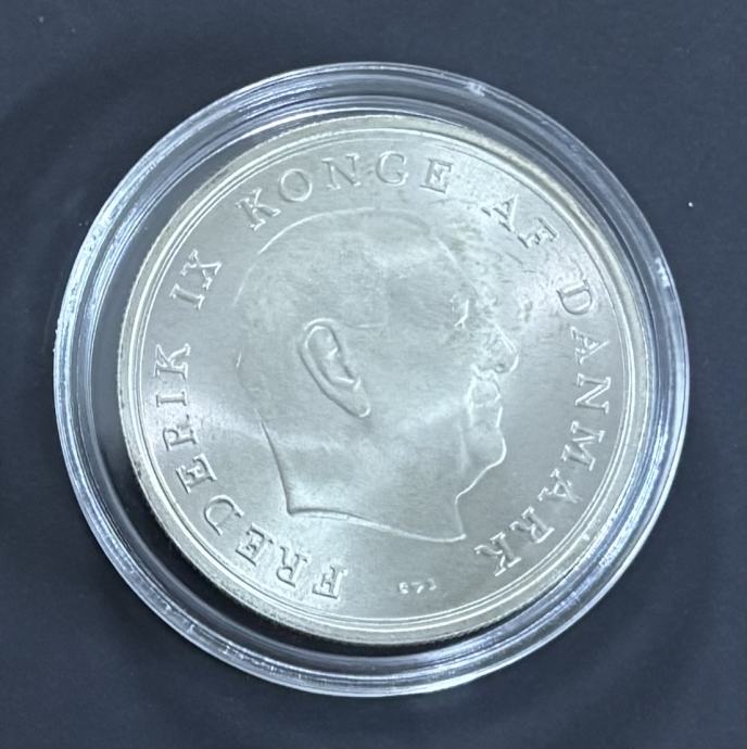 Na aversu se nalazi portret kralja Frederika IX, dok je na reversu prikaz princeze Margrethe i princa Henrika. Kovanica je izrađena od srebra i namijenjena kolekcionarima.