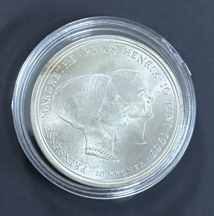 Prodajem srebrnu prigodnu kovanicu Kraljevine Danske nominale 10 kruna, izdanu 1967. godine povodom vjenčanja princeze Margrethe (danas kraljice Margrethe II).
