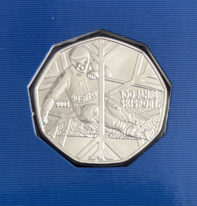Prodajem prigodnu austrijsku srebrnu kovanicu nominale 5 eura izdanu 2005. povodom 100 godina skijaškog sporta.