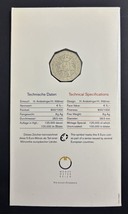 Srebro / Srebrnjak 5 € Austrija 2005 – Europska himna (Europahymne)