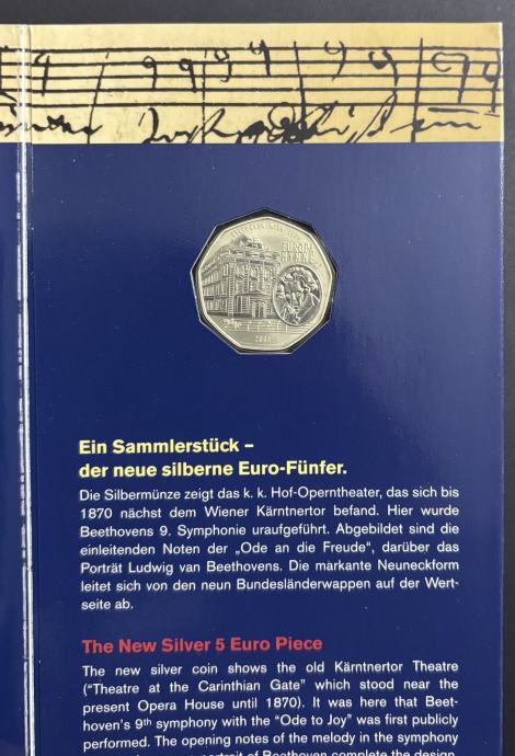Na reversu kovanice prikazan je Beethoven uz bečku Operu (Kärntnertor-Theater), mjesto gdje je prvi put izvedena 9. simfonija, dok avers nosi nominalnu vrijednost 5 eura u karakterističnom deveterokutnom obliku austrijskih srebrnjaka.