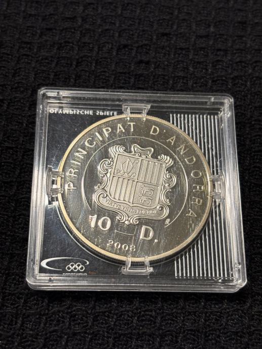 Andora 10 Diners 2008 srebrnjak, izdan povodom Zimskih olimpijskih igara i nove discipline skicross 2010. Srebro 925/1000, težina 28,2 g, promjer oko 38 mm. Kvaliteta UNC (nekorišten, odlična očuvanost). Avers grb Andore i nominala 10 D., revers prikazuje skijaše u natjecanju. Idealno za kolekcionare i ljubitelje olimpijskih motiva.