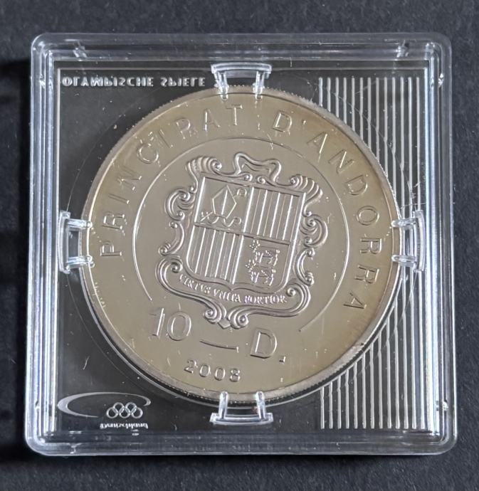 Prodajem srebrnu kovanicu nominale 10 Diners, izdanje Kneževine Andore iz 2008. godine, posvećenu sportu ski cross kao novoj olimpijskoj disciplini.