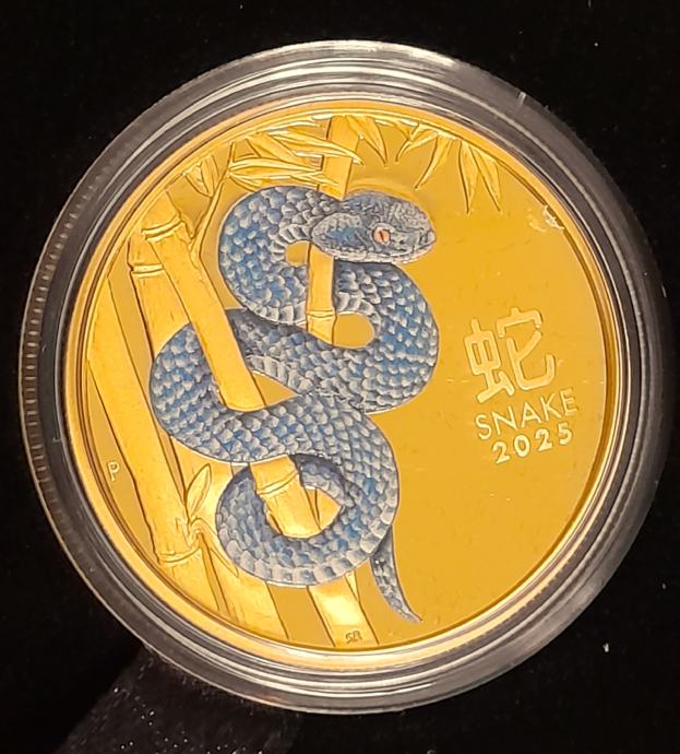 - Zlatnik prikazuje prikaz plave zmije u živim bojama sklupčane među stabljikama bambusa. U kineskoj kulturi, bambus je sinonim za vrlinu i integritet, dodajući dodatnu simboliku ovom iznimnom komadu. U dizajnu je ugrađeno kinesko slovo za 'Zmiju', natpis 'ZMIJA 2025' i oznaka kovnice Perth Mint 'P'.