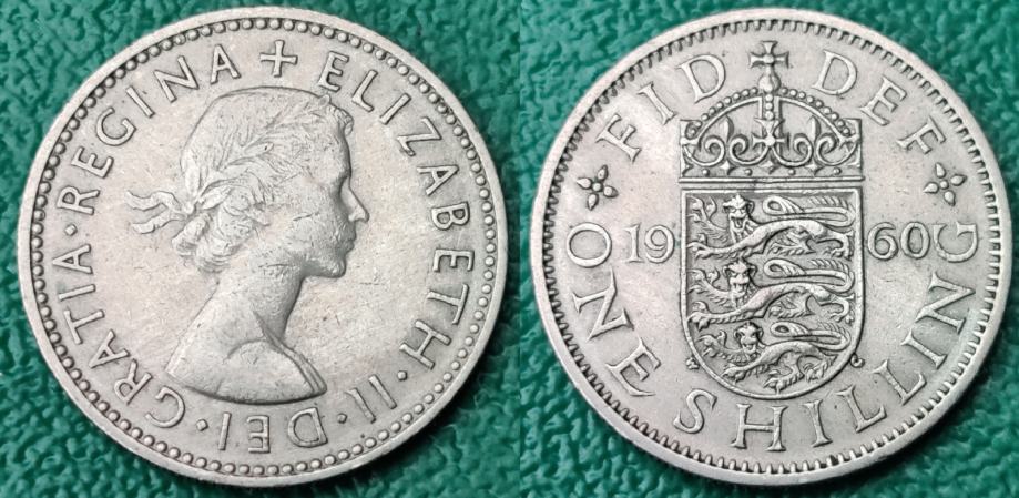 United Kingdom 1 shilling, 1960 English arms, three lions on shield +/