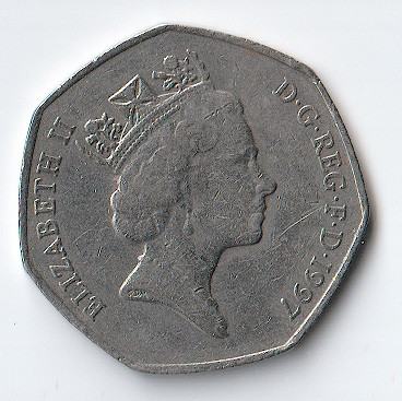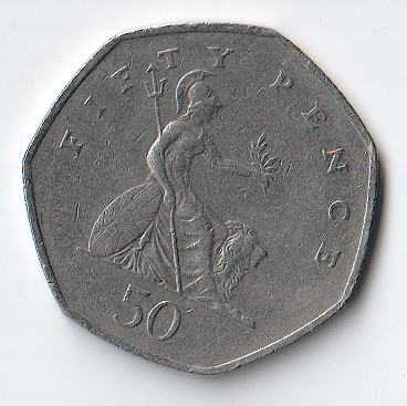 Britanska kovanica 50 Pence iz 1997. godine s klasičnim motivom Britannije.