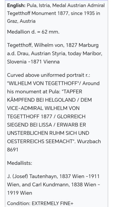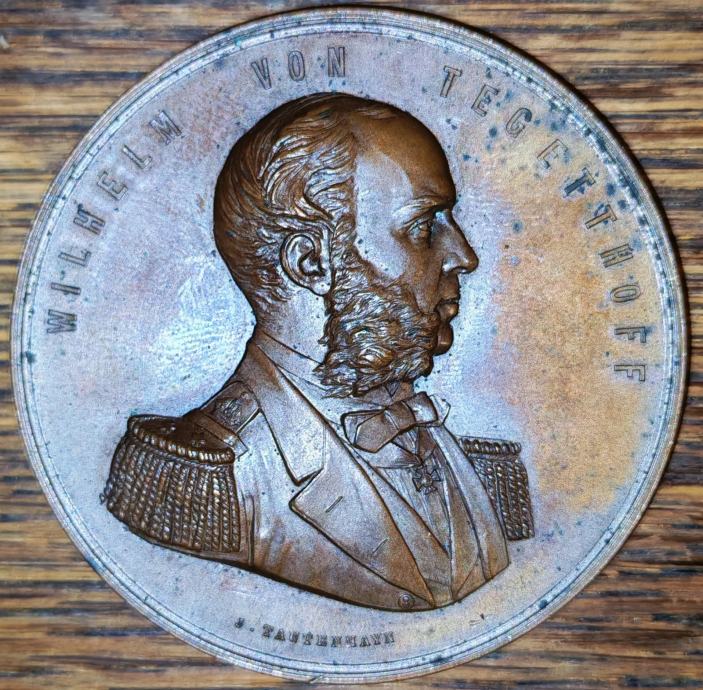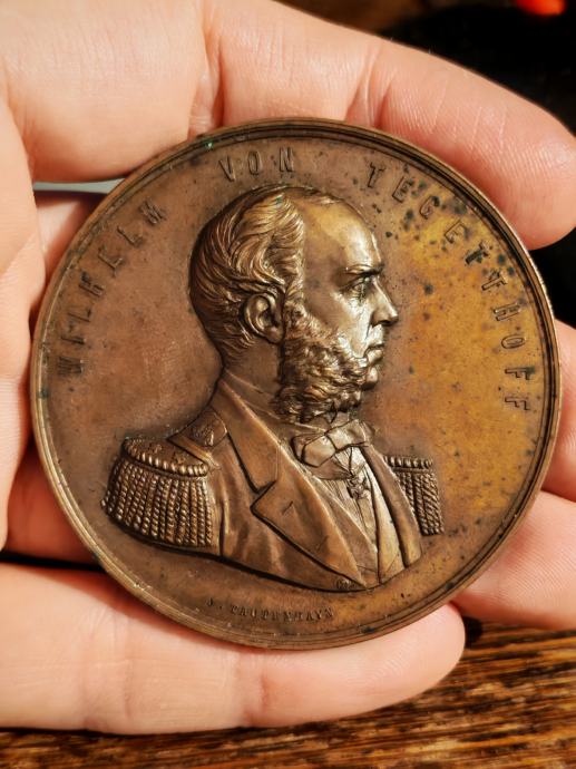 Original patina, izuzetno očuvana kvalitete XF / aUNC - velika broncana medalja admirala Wilhelma von Teggethoffa, junaka i pobjednika u velikoj pomorskoj bitci kod otoka Visa 1866.g.