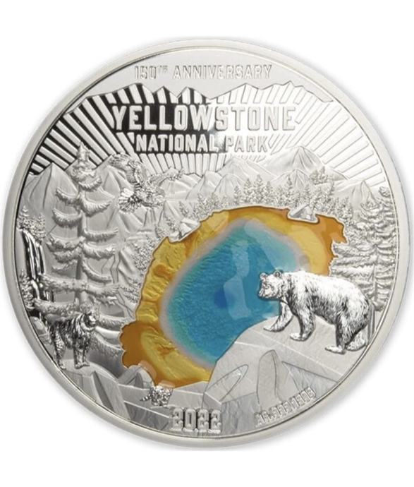 Riječ je o suvremenoj kolekcionarskoj srebrnoj kovanici s motivom Yellowstone National Parka, izdanoj povodom 150. obljetnice parka (natpis “150th Anniversary Yellowstone National Park” vidljiv je na aversu).
