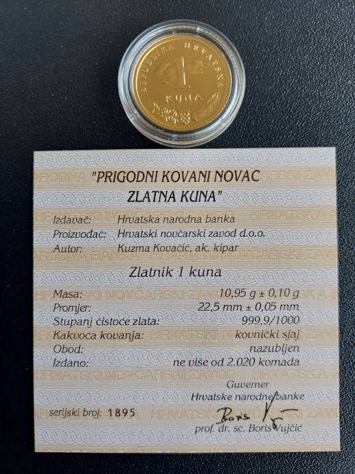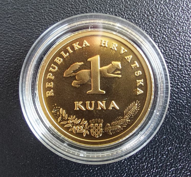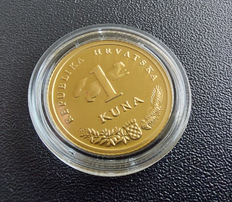 Prodajem primjerak zlatnika 1 kune koji je izdan u ograničenoj seriji od 2020 komada, pakiran u kapsulu i kuvertu te pripada kategoriji investicijskog zlata. Zlatnik dolazi s certifikatom HNB-a.