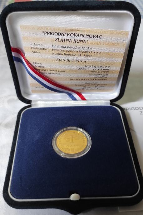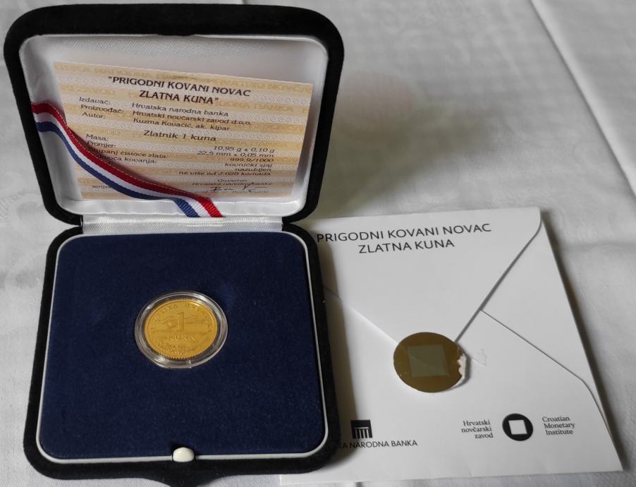 Zlatna kuna, u kapsuli, sa certifikatom, kuvertom.