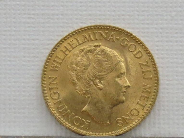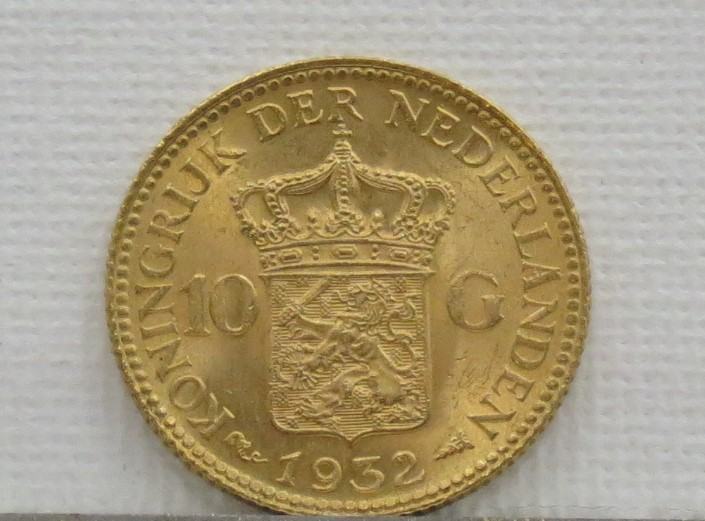 Holandski zlatnik od 10 Guldena iz 1932 godine, zadnji zlatni gulden koji je iskovan za vladavinu Kraljice Wilhelmine. iskovan je u dve serije 1932 i 1933 godine ali a istim dizajnom.