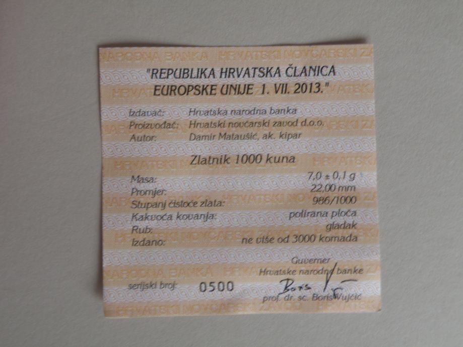 ZLATNIK 1000 KUNA -REPUBLIKA HRVATSKA ČLANICA EUROPSKE UNIJE-2013.
