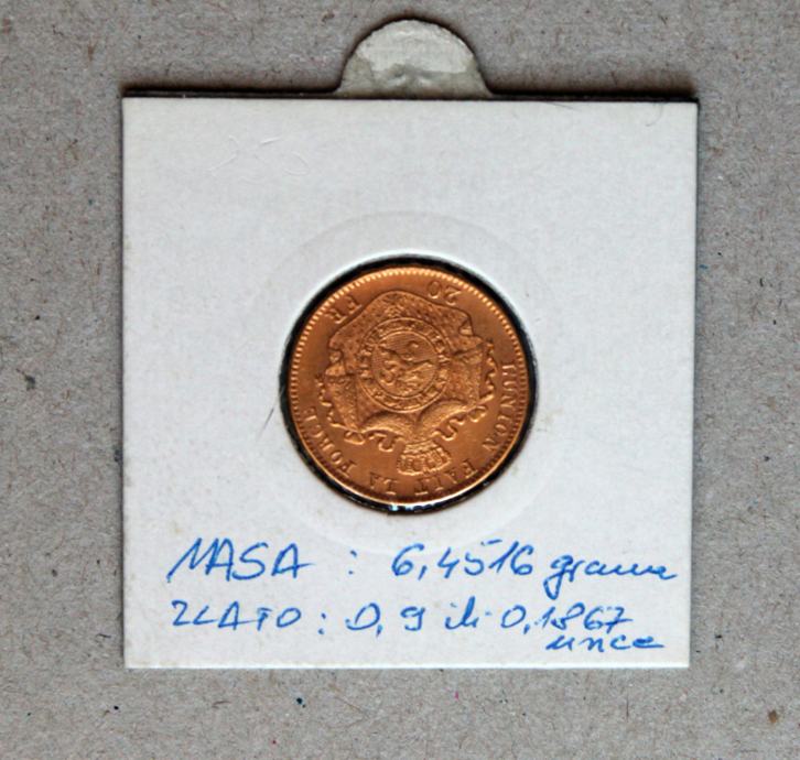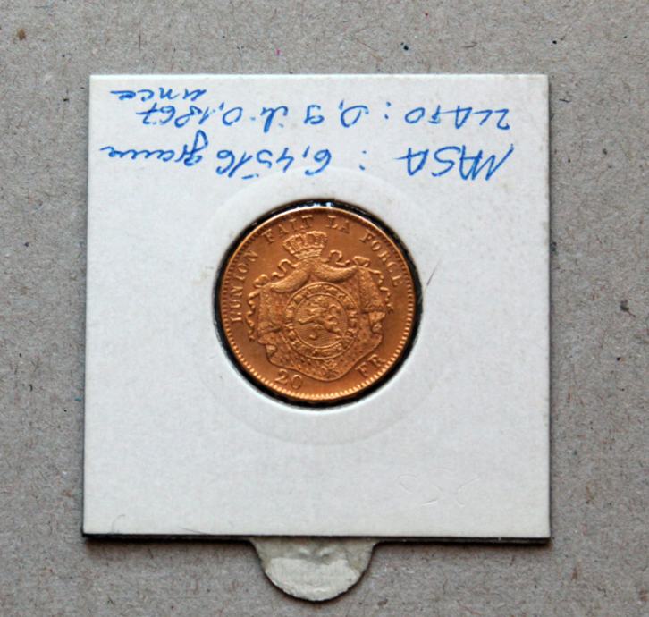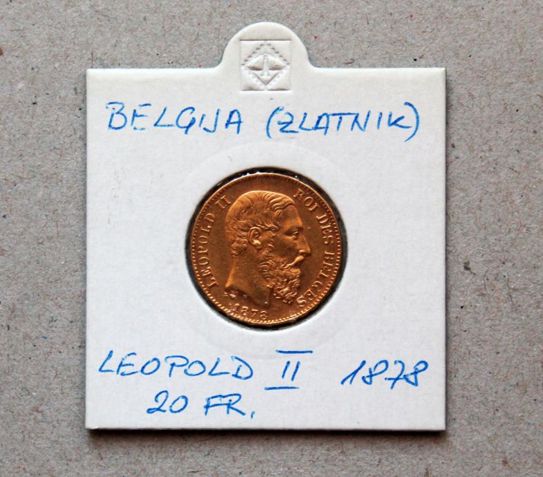 Riječ je o zlatniku latinske monetarne unije iz Belgije iz 1878. godine, nominalne vrijednosti 20 FR.