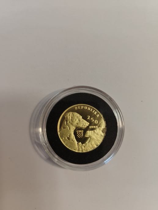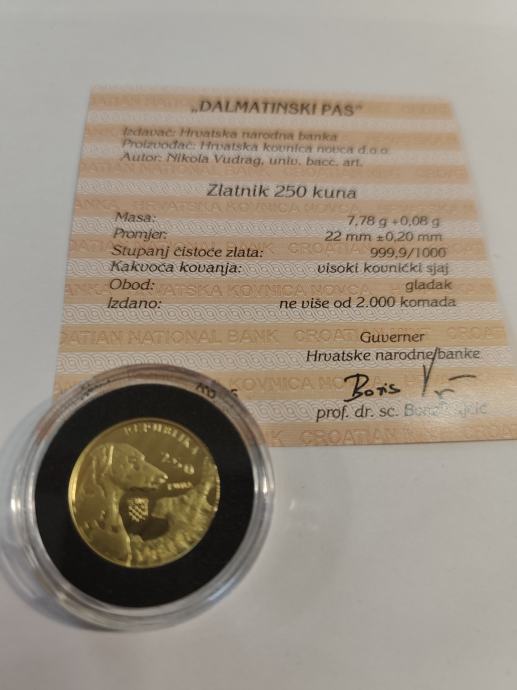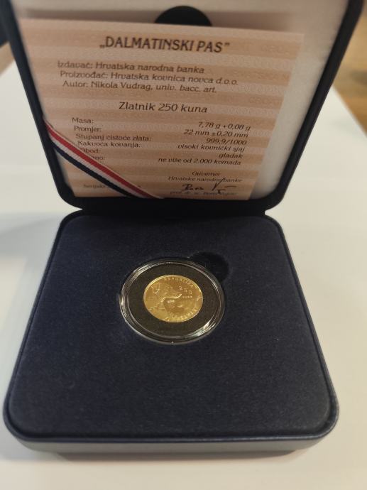 Zlatnik dalmatinski pas od 1/4 unce. Zlatnik se nalazi u ukrasnoj kutiji sa certifikatom koji potpisuje guverner Hrvatske narodne banke. Samo osobno preuzimanje u Petrinji ili Zagrebu. Mob. 099 267 4205.