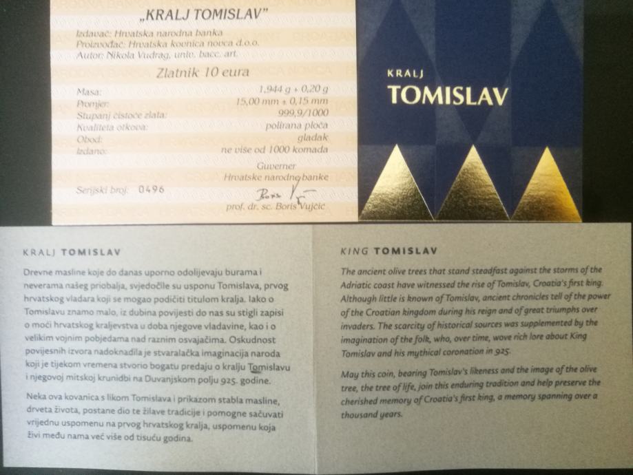 Zlatnik - KRALJ TOMISLAV - izdan u samo 1000 primjeraka - CERTIFIKAT - 1/16 unce,