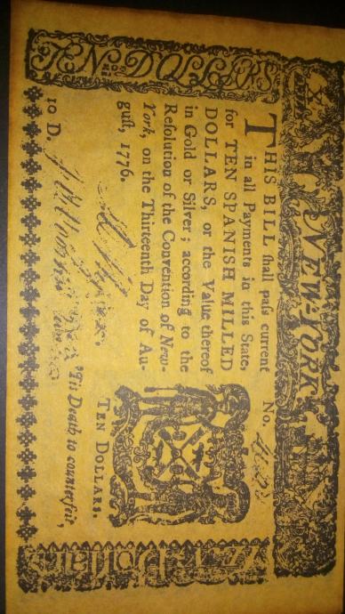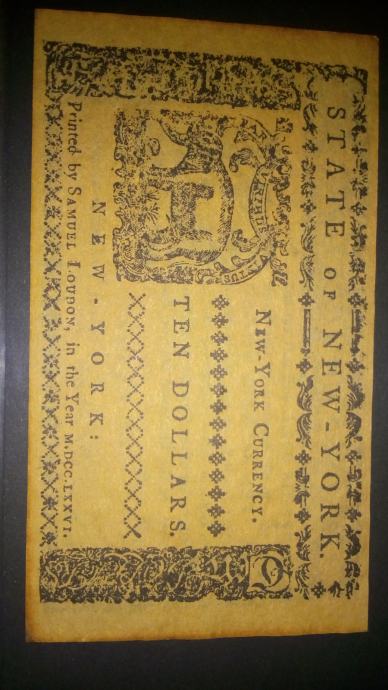 10$ Colonial Currency State of NY 1776 (f) - cotton Replica