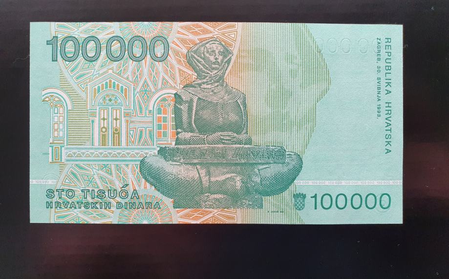 Prodajem novčanicu 100 000 hrvatskih dinara iz 1993. godine, novčanica je u savršenom stanju(UNC). Moguć dogovor oko cijene. Odgovaram na poruke ukoliko vas nešto zanima.