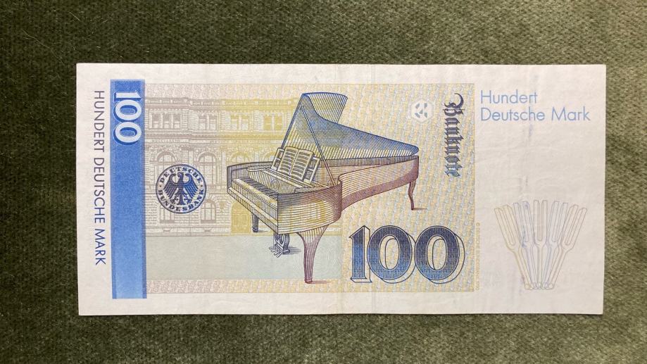 Novčanica 100 njemačkih maraka (Hundert Deutsche Mark), serija 1.August 1991, UNC kvalitete, nije bila u optjecaju, bez tragova na rubovima, bez pregiba, papir cist i jasnih boja, bez poderotina, bez rupa.
