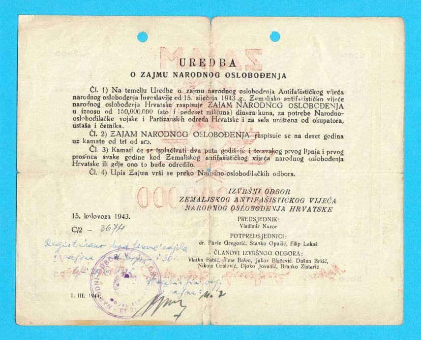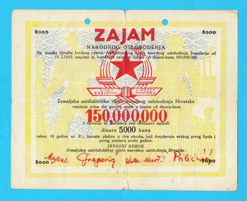 1943 HRVATSKA ZAJAM NARODNOG OSLOBOĐENJA 150.000.000 din/kun Partizani