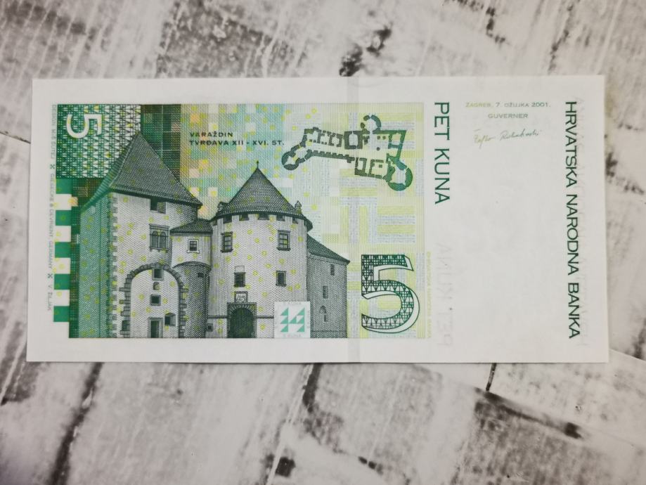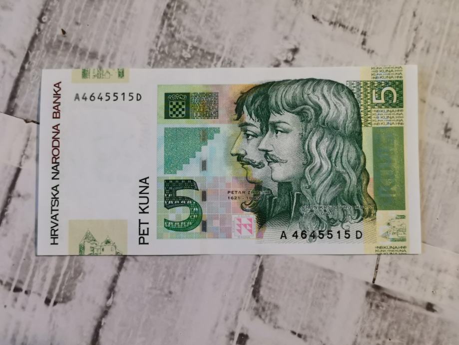 5 hrvatskih kuna, portreti Frana Krste Frankopana i Petra Zrinskog, 2001. godina, najljepša hrvatska novčanica 9,99 eura.