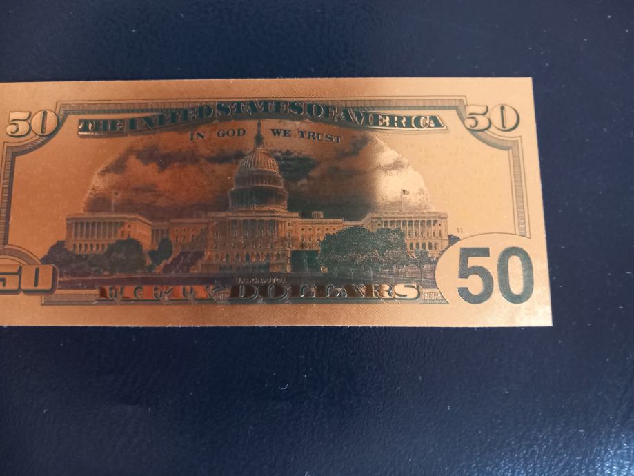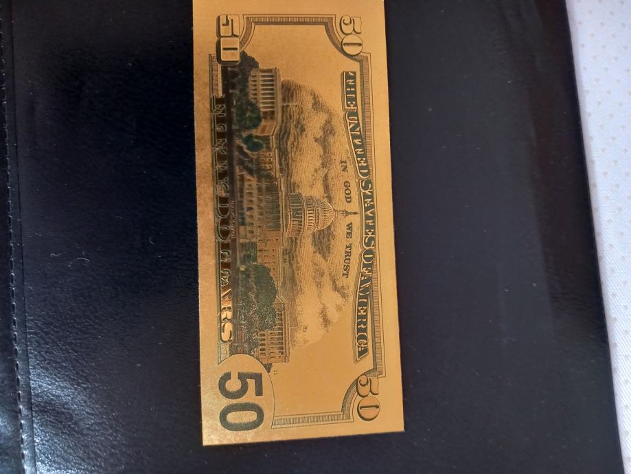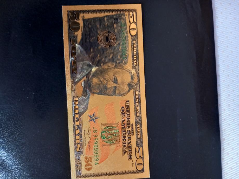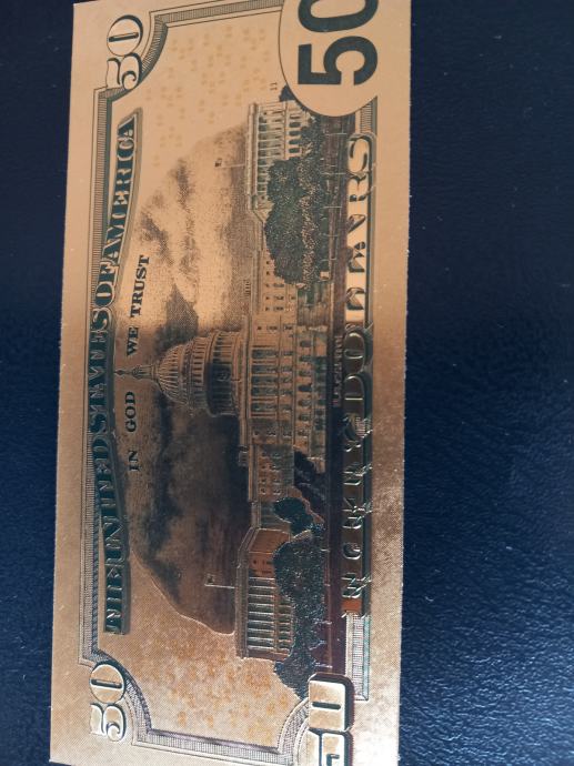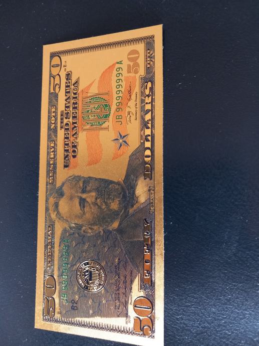 50 FIFTY DOLLARS THE UNITED STATES OF AMERICA FEDERAL RESERVE NOTE IN GOD WE TRUST NUMERIRANA JE POG BROJEM JB 99999999 A B2 NOVČANICA JE OBOJENA ZLATNOM BOJOM NIJE SAVINUTA ŠALJEM I POŠTOM RIJETKA JE ZATO JE I IZVANREDAN POKLON ZA NUMIZNATIČARE.