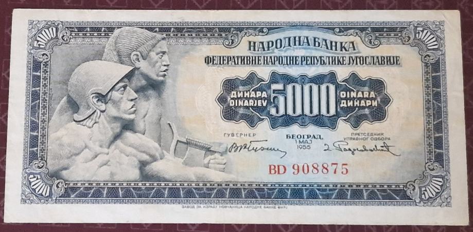 5000 dinara 1955 XF+/AUNC- sa brojem 2
