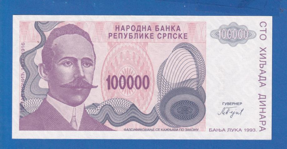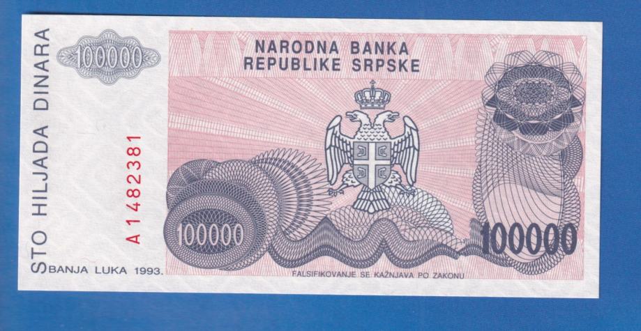 BANJA LUKA 100 000 DINARA 1993 UNC ser A1482381 / 2094