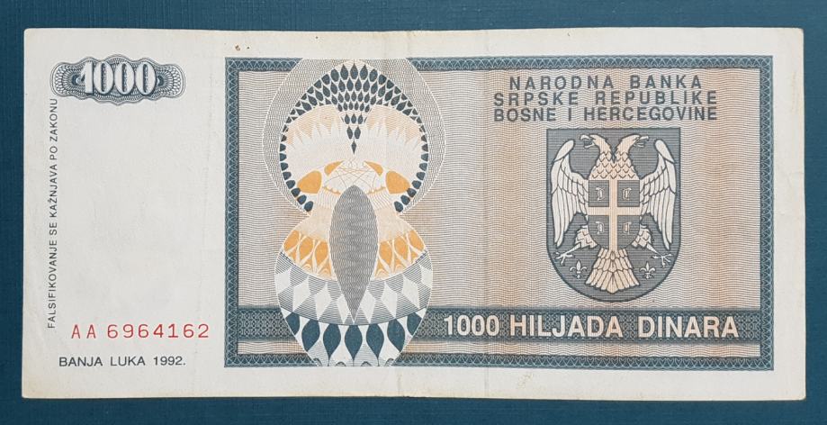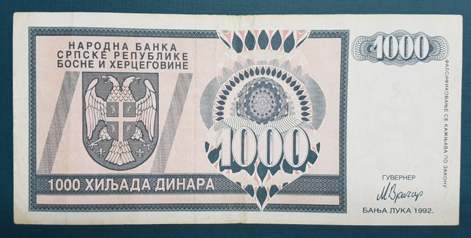 BIH, 1000 DINARA, BANJA LUKA, 1992.