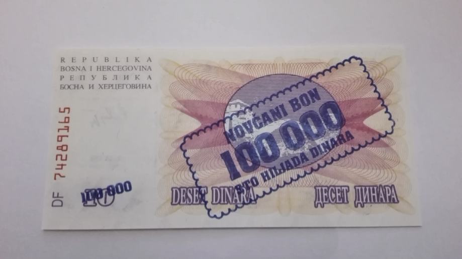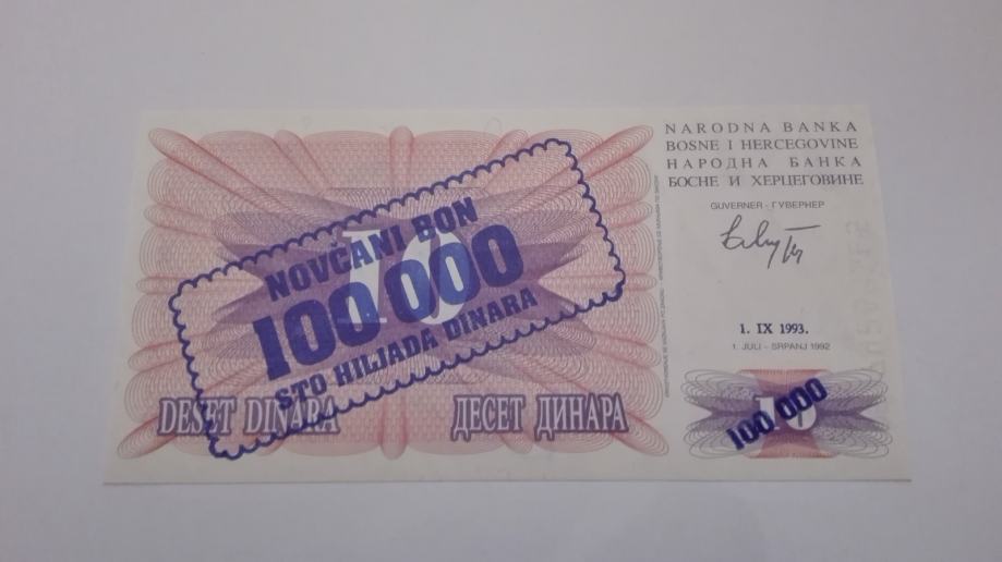 BIH PRETISAK NOVČANICA BON 100 000 DINARA 1993 GODINA UNC